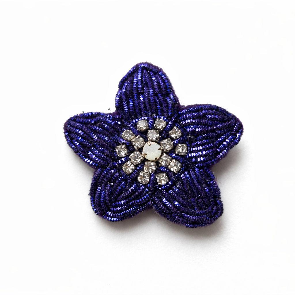 Broszka w kształcie kwiatu, ręcznie haftowana kanitelem i czeskimi kryształkami.