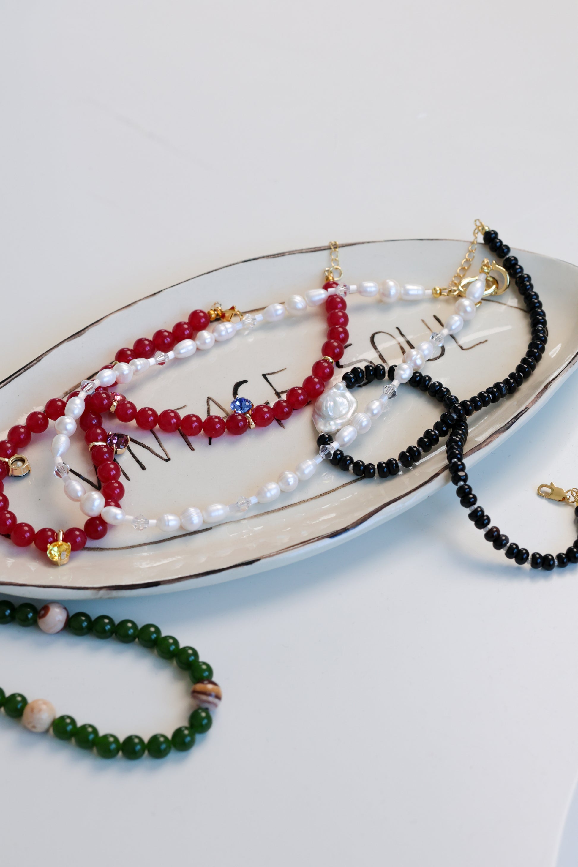 Ніжне намисто із зеленого авантюрину, доповнене акцентами тонованого кварцу та рожевої яшми. Поєднання глибокої зелені й м’яких теплих відтінків створює прикрасу з відчуттям природної рівноваги та спокою.