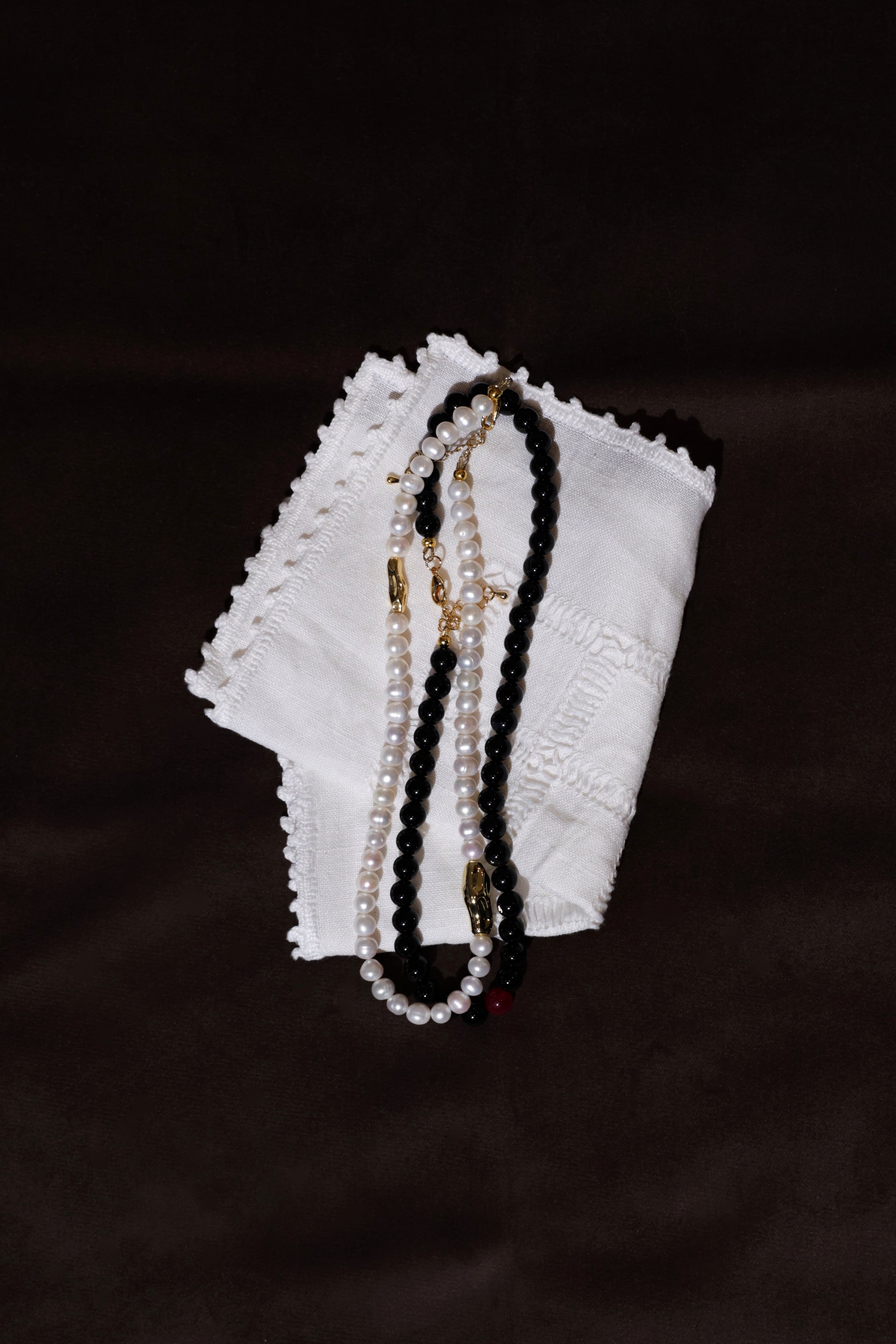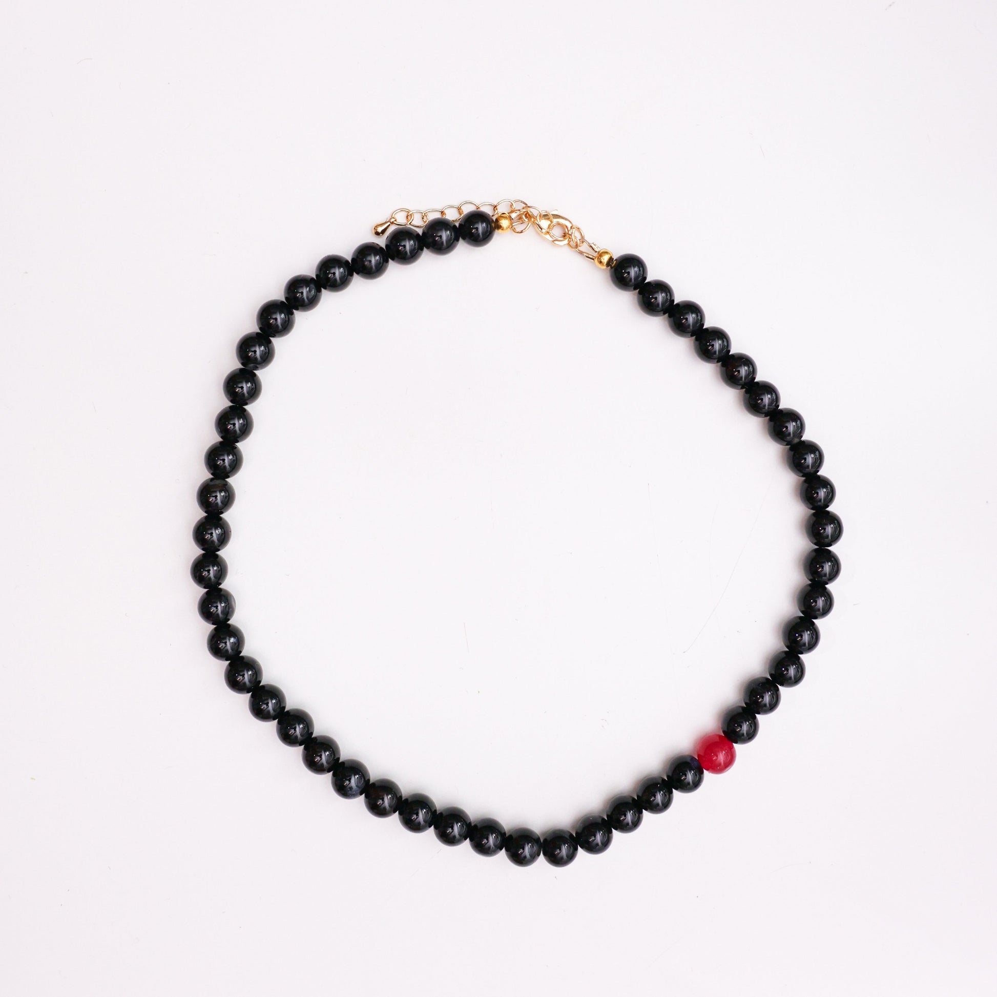 Minimalistyczny naszyjnik z naturalnego czarnego agatu z subtelnym akcentem kwarcu truskawkowego. Kontrast głębokiej czerni i czerwieni tworzy wyrazistą, ale elegancką kompozycję. Ręcznie wykonany, wykończony pozłacanymi elementami 18K.