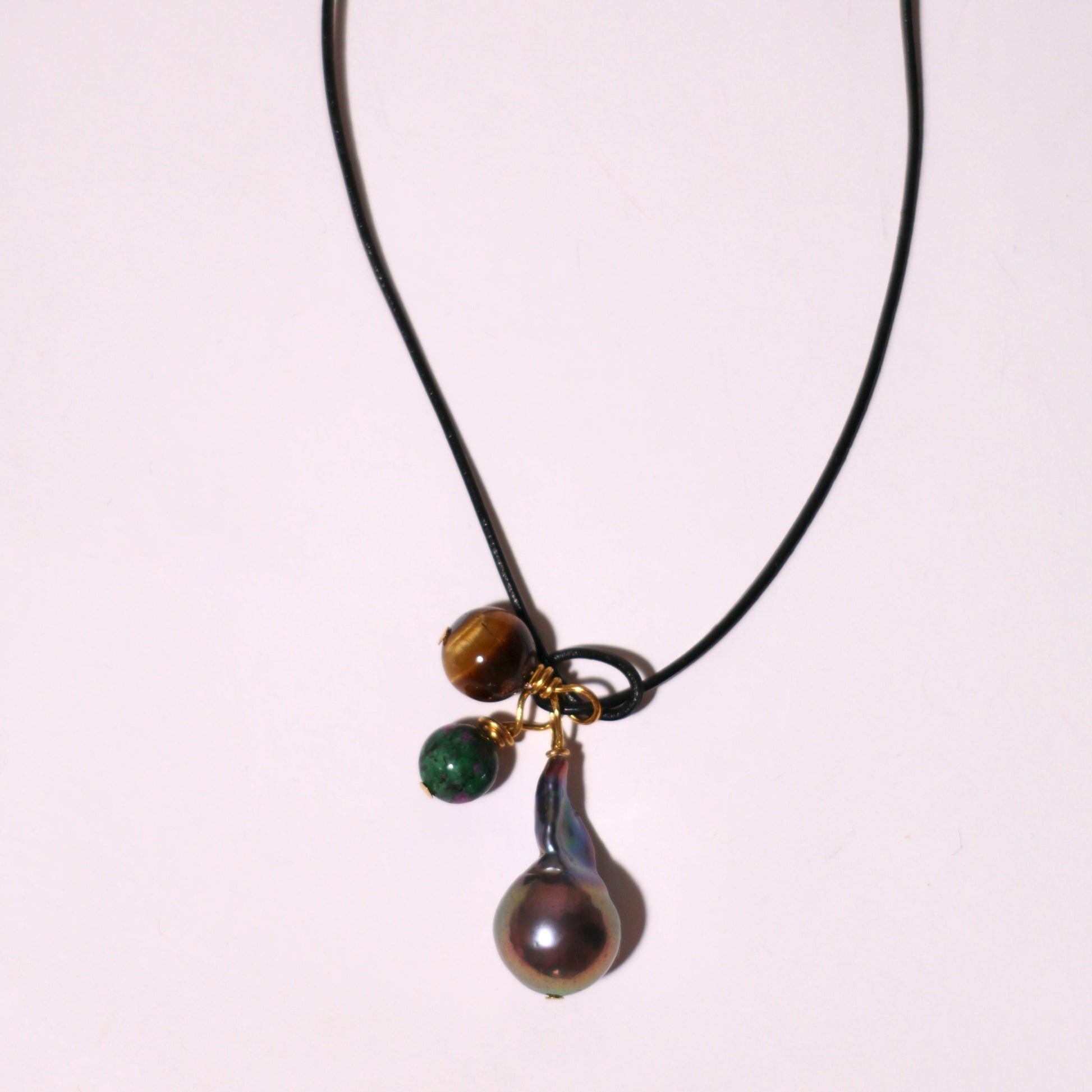 Неочевидне, із характером — це намисто поєднує барокову перлину з природним блиском і мікс натуральних каменів: тигрове око, малахіт, жадеїт.