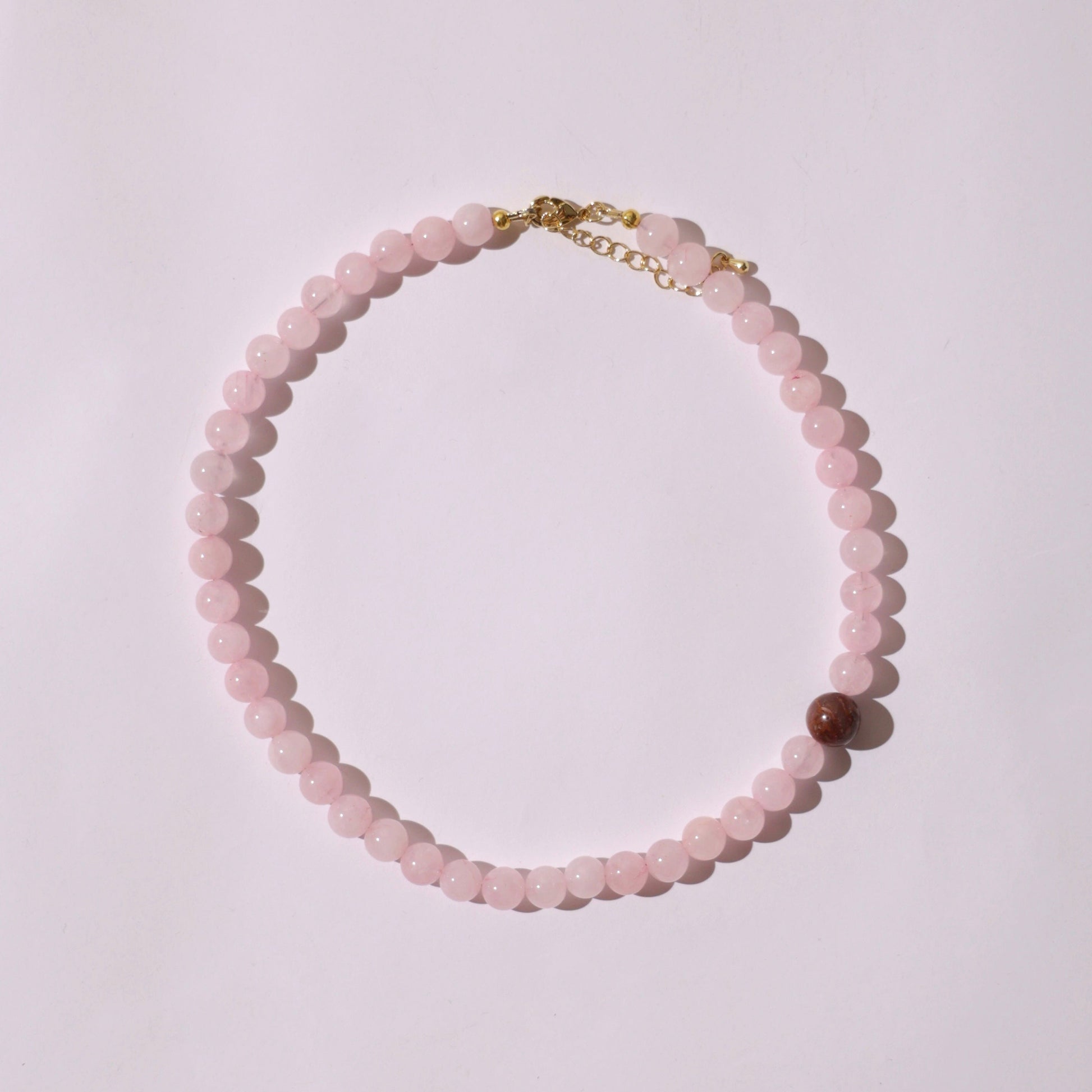 Ніжне, витончене й гармонійне — це намисто поєднує рожевий кварц із акцентом яшми, утворюючи лаконічну й символічну композицію.