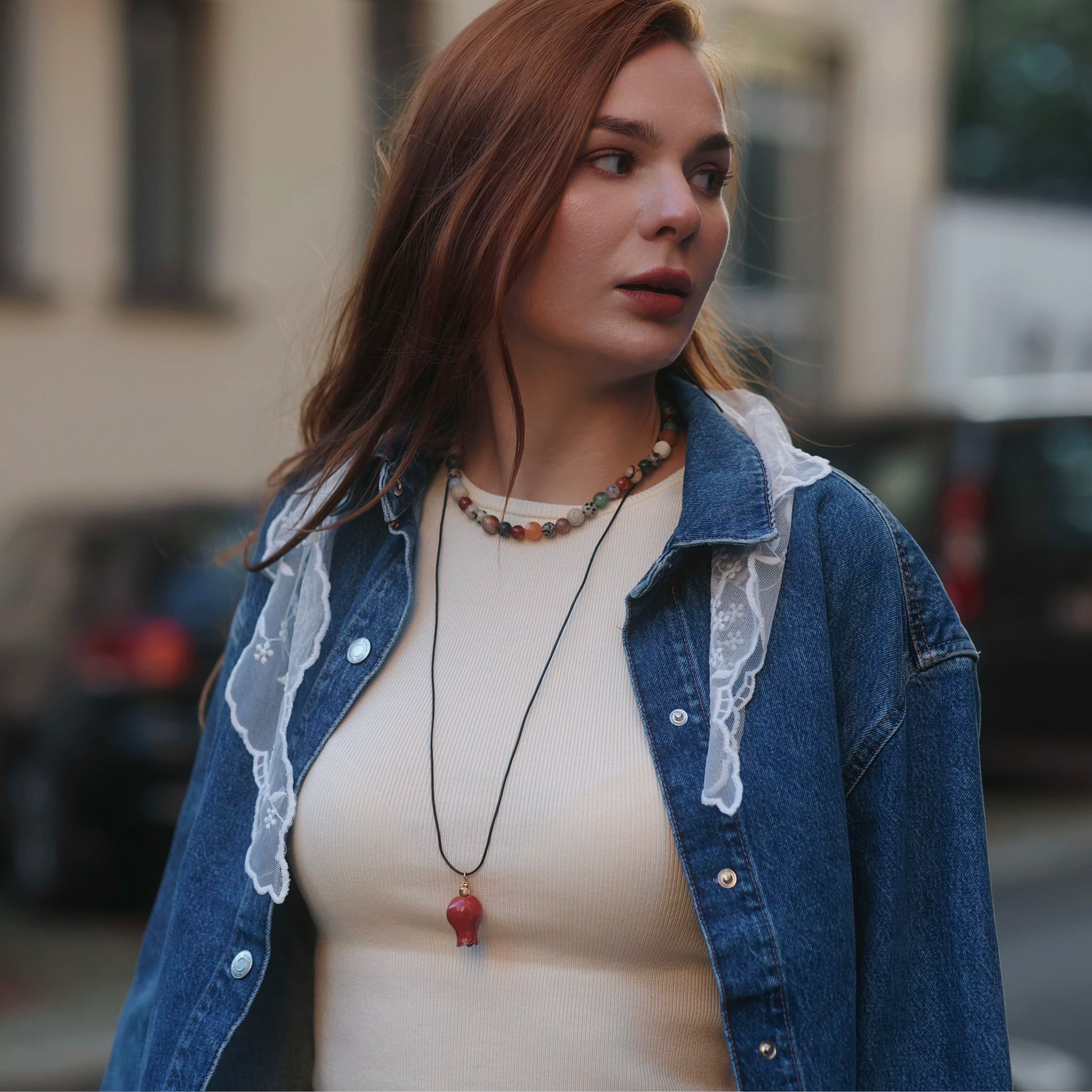 Насичений червоний відтінок і природна форма роблять його прикрасою з характером і сенсом.