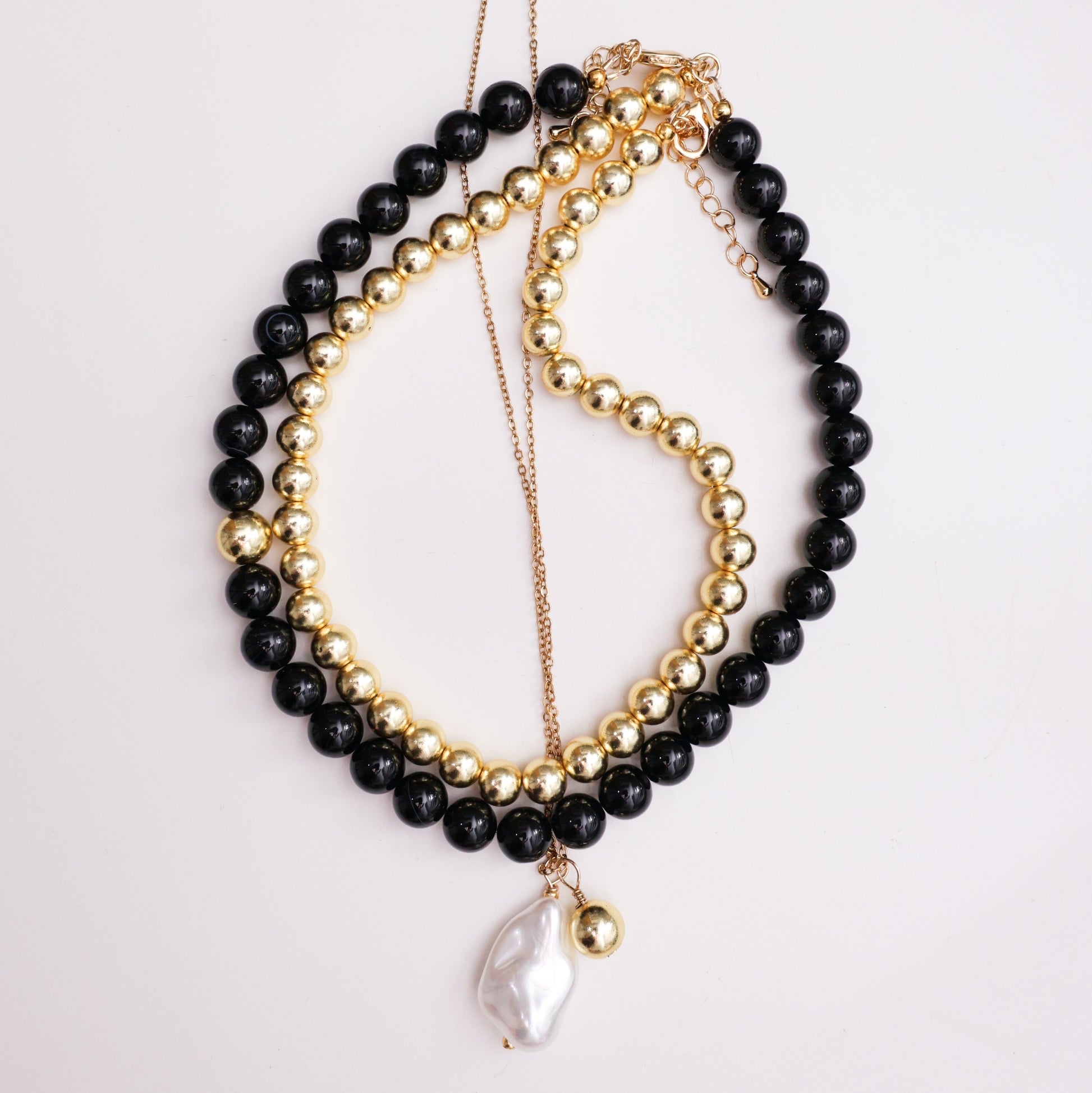 Połączenie czerni, złota i perły tworzy elegancką, warstwową kompozycję o ponadczasowym charakterze.