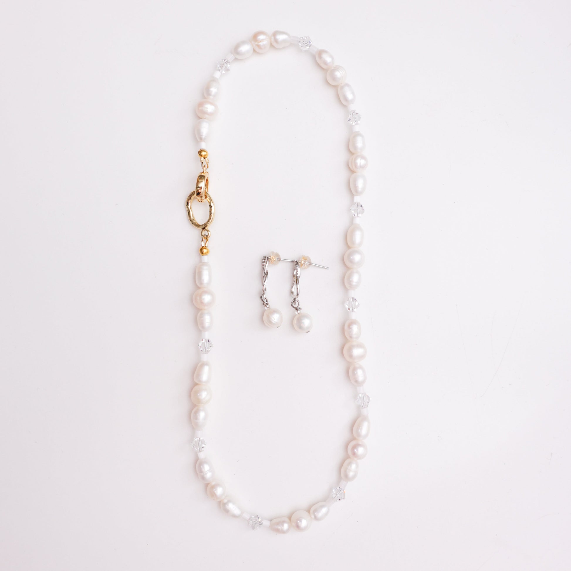 Subtelna kompozycja światła i miękkiego połysku. Naturalne perły nadają elegancji, czeski kryształ delikatnie odbija światło, a japoński koralik dopełnia całość minimalistycznym akcentem. Zestaw idealny do codziennych stylizacji i wyjątkowych okazji.